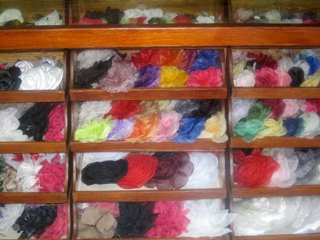 Tudooooo em caixinhas...fitas, penas, contas... Os chapéus em caixas redondas, forradas, que deviam ter uns cinquenta anos também.